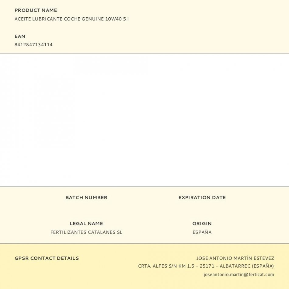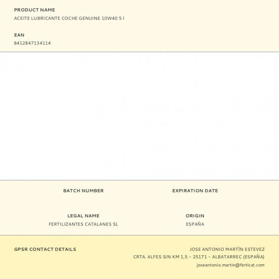 Aceite lubricante coche genuine 10w40 5 l formulado con tecnología sintética y una aditivación que proporciona alta protección al motor. para motores gasolina y diésel de inyección directa, siendo apto para motores duales de gnc/glp, tanto en vehículos ligeros como en vagonetas off-road, 4x4 y vehículos diésel ligeros (camionetas y camiones ligeros). para turismos de alta gama y prestaciones: berlinas, deportivos, y en general, aquellos dotados de mecánicas muy potentes. fabricado en españa bajo la norma iso - 9001