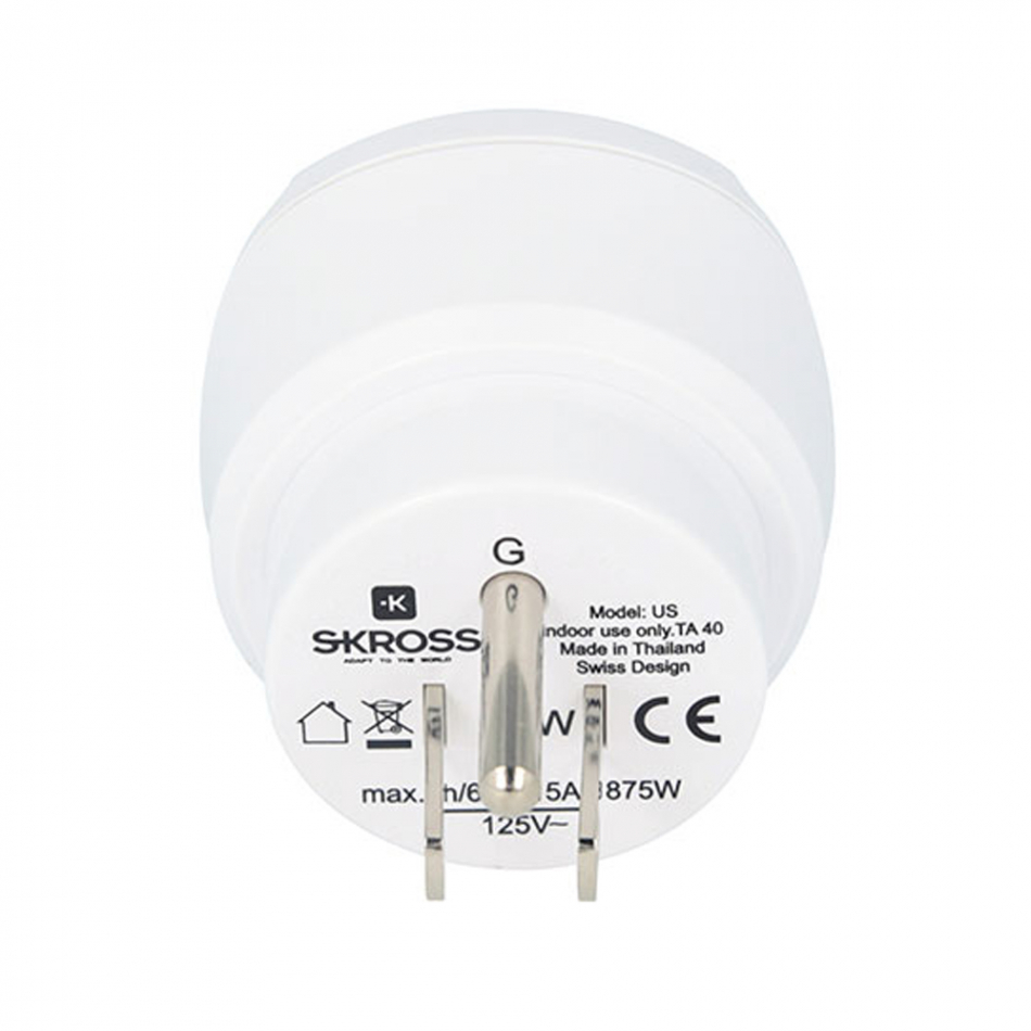 Adaptador europeo a estados unidos skross 1500203-e. diseñado en suiza. ideal para equipos con enchufes con y sin conexión a tierra (2 y 3 polos). entrada: europa de 3 polos (2p+t tipo f) y europa de 2 polos. enchufe de salida: estados unidos. voltaje de entrada: 100v/250v. máx. carga: 15a. clasificación de potencia: p. 100v/500w 250v/3750w. no convierte voltaje.
