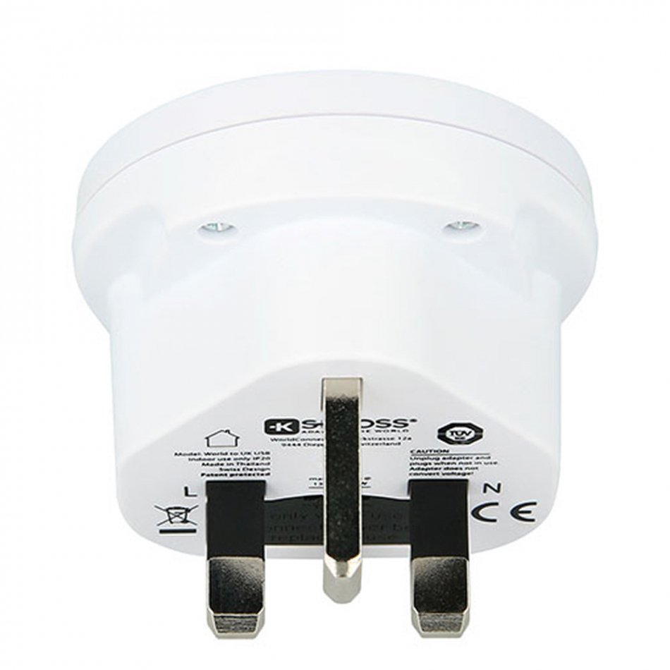 Adaptador mundial a reino unido con usb skross 1500267. diseñado en suiza. ideal para equipos con enchufes con y sin tierra (2 y 3 polos) y dispositivos usb. entrada: europa, australia/china, reino unido, estados unidos/japón, suiza, italia, brasil. salida: reino unido. tensión de entrada: 100v/250v. máx. carga: 7a. potencia nominal: p. ej. 100v/700w 250v/1750w. salida usb tipo a: 5,0v cc / máx. 2,4a, máx. 12,0w en total. consumo de energía sin carga: 0.05w. no convierte voltaje.