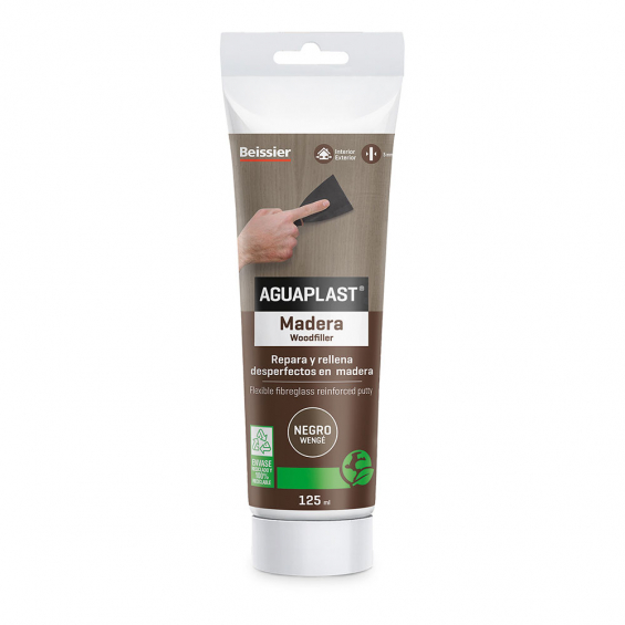 Aguaplast madera negro wenge 125ml. masilla lista al uso para reparar, rellenar y nivelar pequeñas grietas, agujeros y desperfectos sobre todo tipo de maderas. reforzado con fibra de vidrio. moldeable. recortable. sin disolventes. muy flexible, se adapta a las deformaciones de la madera hasta un 20%. ligero, no descuelga. para interior y exterior. color negro wenge.