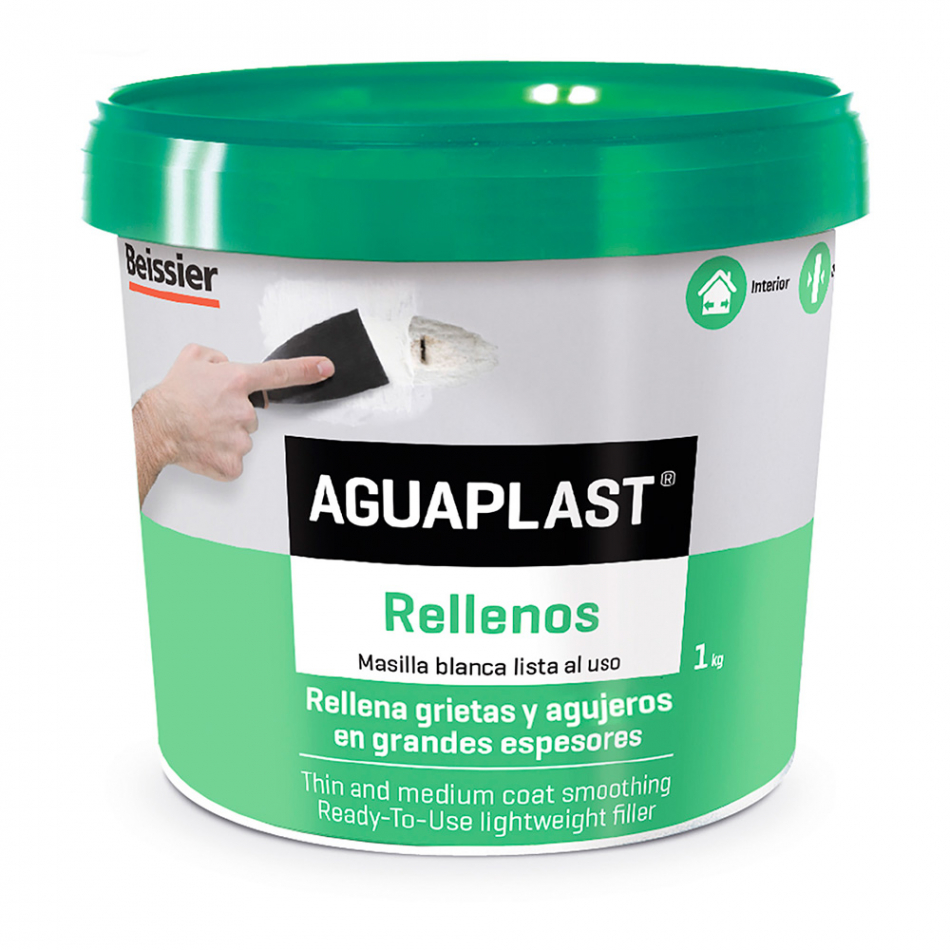 Aguaplast rellenos 1kg masilla lista al uso para rellenar grietas y agujeros en grandes espesores. enlucidos en capa media. nivelación de superficies ligeramente irregulares. enlucidos sobre placas de porexpan. reparación de fisuras y grietas hasta 5mm de ancho. excelente tapa-grietas. buena capacidad de relleno. no descuelga. ligero. color blanco. para interior