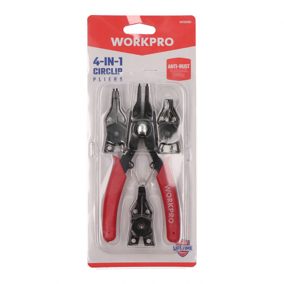 Alicate de puntas intercambiables para arandelas circlip, anillos de retención, anillos de bloqueo 4-en-1. acero 65mn ennegrecido y pulido. agarre cómodo. puntas de alicates: 2x0° 1x45°, 1x 90°. workpro