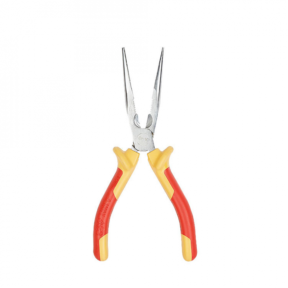 Alicate de punta larga aislado vde 160mm. acero al cromo vanadio con revestimiento ni-fe. mango de agarre cómodo de dos materiales. las protecciones integrales evitan el contacto de las manos con elementos conductores. tensión aislada hasta 1. 000 v ac. workpro