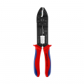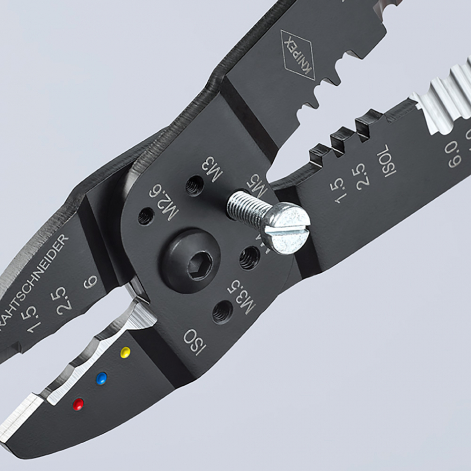 Alicates para entallar terminales 9722240sb knipex. alicates para crimpar para cortar y pelar cables y crimpar terminales con perforaciones para cortar pasadores roscados de cobre y latón alicate negro, lacado, mangos con fundas multicomponentes. 270g. dimensiones: 62x25x240mm con perforaciones para cortar pasadores roscados de cobre y latón (m 2,6/m 3,0/m 3,5/m 4,0 y m 5) articulación atornillada para una elevada estabilidad y un movimiento uniforme. acero especial, de alta resistencia.
