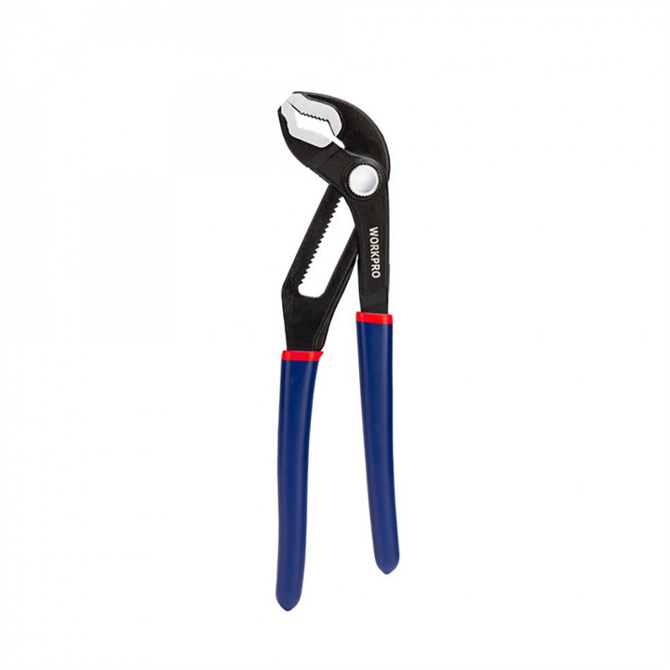 Alicates de pico loro de 200 mm (8") de ajuste rápido . material acero forjado, al cromo vanadio. mango de agarre cómodo de tres materiales. mordaza en v. azul y rojo.
