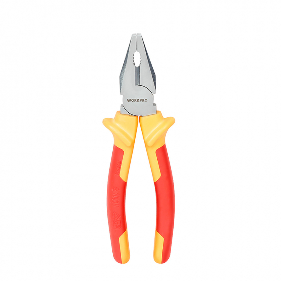 Alicate universal aislado vde 200mm . acero al cromo vanadio con revestimiento ni-fe. mango de agarre cómodo de dos materiales. las protecciones integrales evitan el contacto de las manos con elementos conductores. tensión aislada hasta 1. 000 v ac. workpro