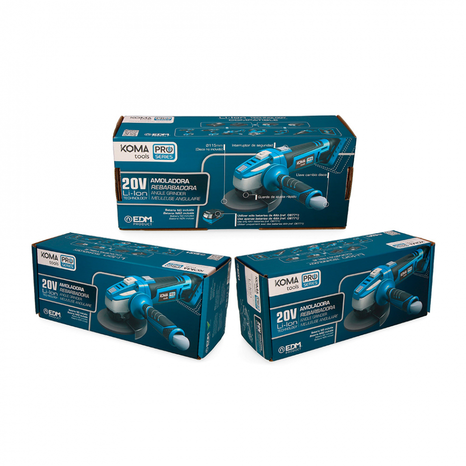 Amoladora de bateria li-ion. potencia: 20 v. (sin batería ni cargador). 9500 rpm. protector para disco de ø115mm (disco no incluido). interruptor de seguridad. para un funcionamiento optimo de este artículo se aconseja utilizar una batería ref. 08771 - accesorios: mango adicional + 1 llave para cambiar el disco. 20v-mp-k, dimensiones: 28,9 x 23,9 cm