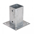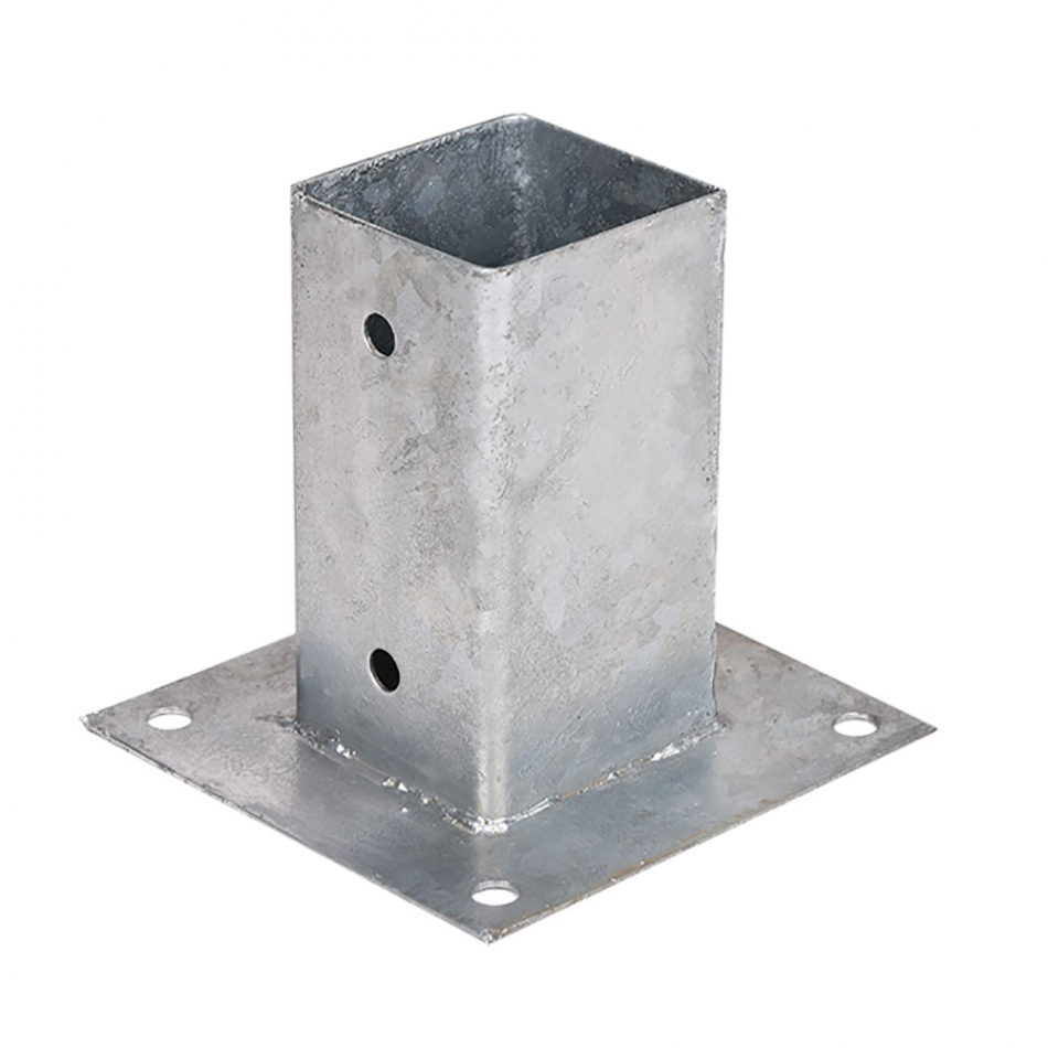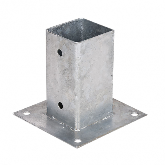 Anclaje cuadrado de acero galvanizado con unas medidas de hueco 7x7cm y la parte de base 15x15cm con dos taladros pasantes para soportar el poste y cuatro taladros en la base faura