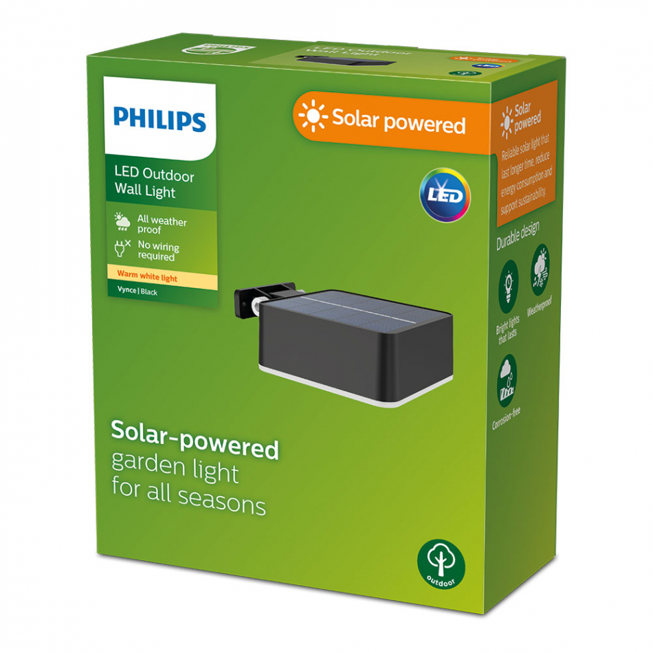 Aplique solar vynce cuadrado, ip 44 1,5w, 200im 2700k, luz cálida, medidas: 10,5x4,6x13,6cm, tipo de flujo 360°, horas de funcionamiento 15.000h aprox. philips