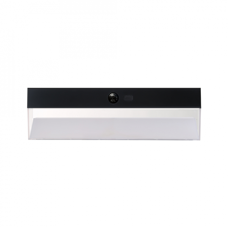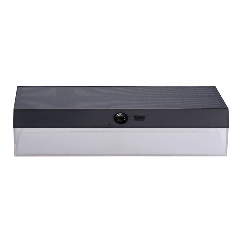 Aplique solar 4 w, 500 lm, 96 led, temperatura de luz ajustable 3.000 / 4.000 / 6.500 k, 3cct, con sensor de movimiento y crepuscular, 3 modos de funcionamiento, rectangular. panel solar 1,5 w policristalino, incluye batería de litio de 2.000 mah 3,7 v (reemplazable). tiempo de carga: 6-8 horas, tiempo de funcionamiento: 8-12 horas, 15.000h, rango de temperatura de trabajo: -10°c a 40°c, ip54, dimensiones: 55 x 30 x 9 cm. material abs + pc, con kit de montaje, color negro
