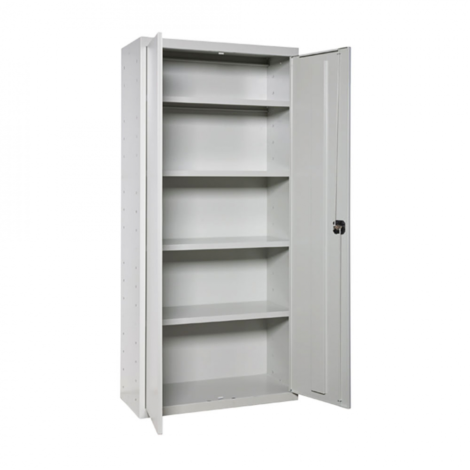 Armario multiusos metalico diy de color gris y las puertas grises. con 2 puertas y 4 estantes con capacidad de carga de 75 kg cada uno, carga certificada a punto de flexion. se entrega desmontado. las dimensiones del armario 80 x 40 x 180 cm. manipulacion sin riesgo, no contiene aristas de corte. con recubrimiento epoxi poliester antirayaduras e ignifugo. producto fabricado en españa.