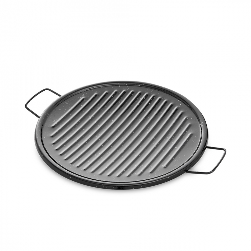 Asador grill esmaltado con asas ø36cm. producto fabricado en acero laminado en frío y recubierto con una capa de esmalte antiácido. las asadoras de acero esmaltado se utilizan para asar todo tipo de carnes, pescados y verduras. apta para fuegos de llama. vaello