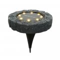 Baliza solar de poliresina. con luz fija blanca cálida. contiene bateria 1.2 v 300 mah y panel solar 2 v . con interruptor de encendido/apagado, encendido automático en la oscuridad. duración estimada de bateria 6 h. bateria remplazable