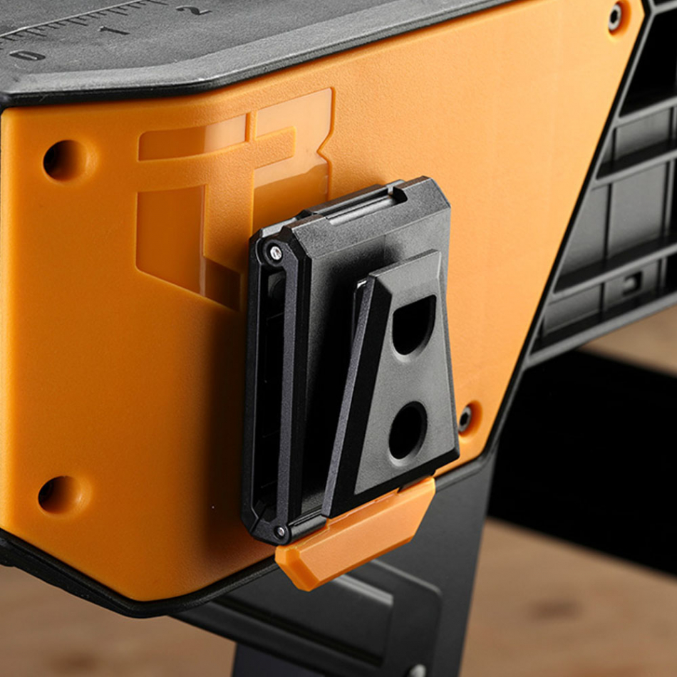 Banco de trabajo de montaje rápido tb-wb700 toughbuilt apertura rápida, simplemente presione y tire para una instalación rápida o plegado soporta hasta 454kg de carga uniforme, se pliega de forma compacta para su almacenamiento, con asa de transporte, superficie inteligente - marcas de medición de referencia rápida múltiples puntos de sujeción, acople un elemento de fijación cliptech® en cada esquina 1 elemento de fijación cliptech incluido