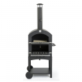 Barbacoa de carbon con horno de piedra. dimensiones: 44,5x65x158cm (ancho/fondo/alto) peso:30kg. cuerpo negro con puertas de acero inoxidable. asa laterial. chimenea ø10x46cm con cubierta ø16x55cm. 2 x parrilas cromadas. 1 x placa ceramica para pizza, termometro negro interior
