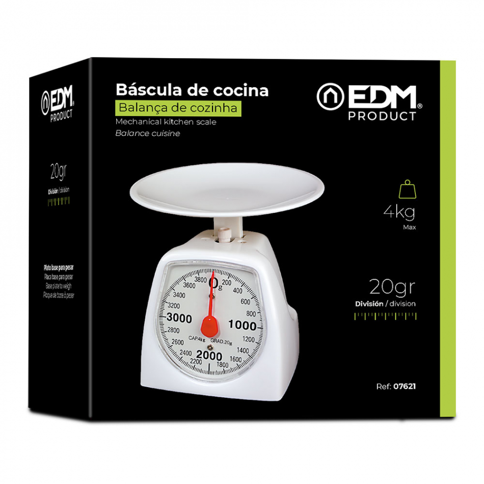 Bascula analogica de cocina max. 4kg escalado de 10g. dimensiones 16,5x16,5x17cm plato ø16,5cm edm