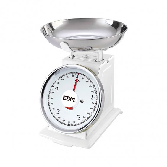 Bascula analogica de cocina max. 5kg edm. estilo clásico. división de lectura de 20g. bandeja de acero inoxidable 20'5x20,5x25,5cm. rosca de ajuste para equilibrar la bascula. edm