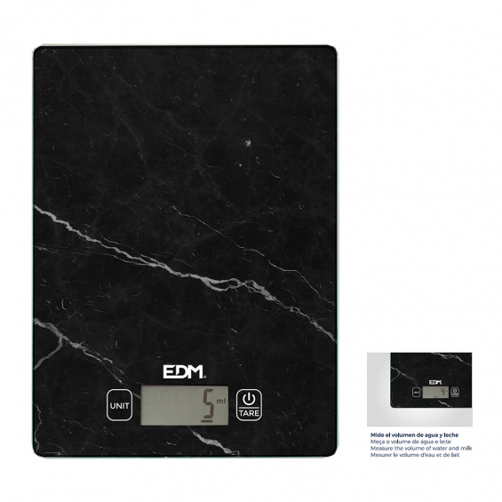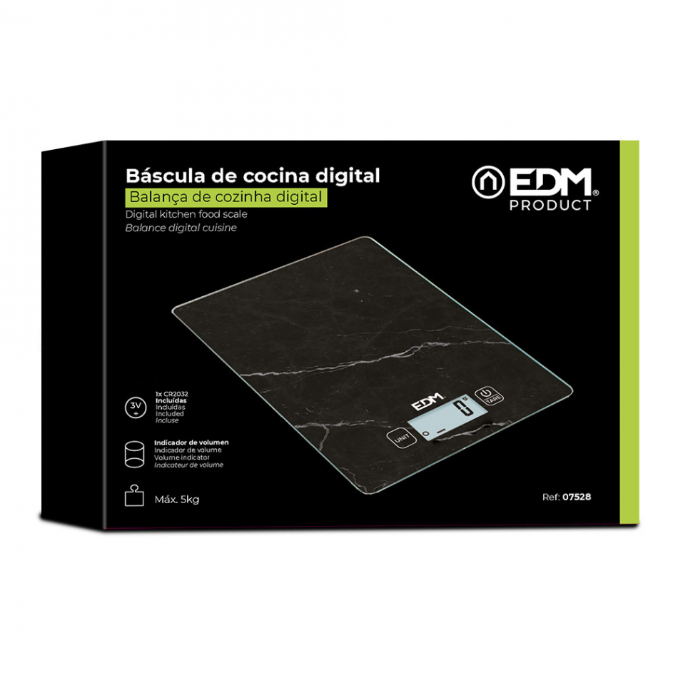 Bascula de cocina digital max 5kg mod 3 edm. acabado cristalizado para una mayor facilidad de limpieza. perfil ultrafino para ocupar el menor espacio posible (15mm). división de lectura 0,001kg. mide el volumen de agua y leche. pantalla lcd con un tamaño de lectura de 4x1,8mm. se apagará la bascula automáticamente después de 2 min sin uso. el peso máximo de lectrua es de 5kg. funciona con una sola pila cr2032. edm.