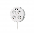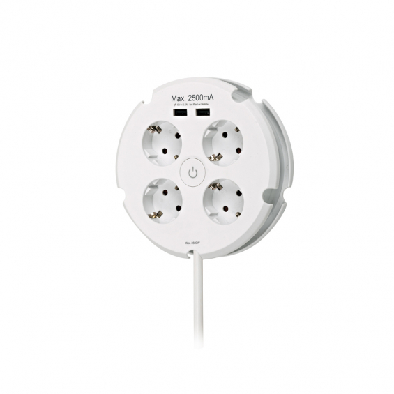 Base múltiple schuko blanca combi 4 tomas 16a 250v + 2 usb ( 2,5a) serie 10, con 1,5 m de cable h05vv-f 3g1,5mm² brico. medida ø16x4cm.