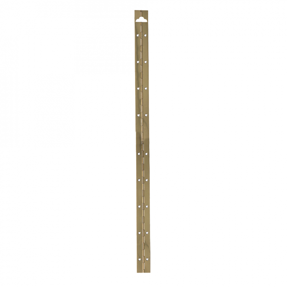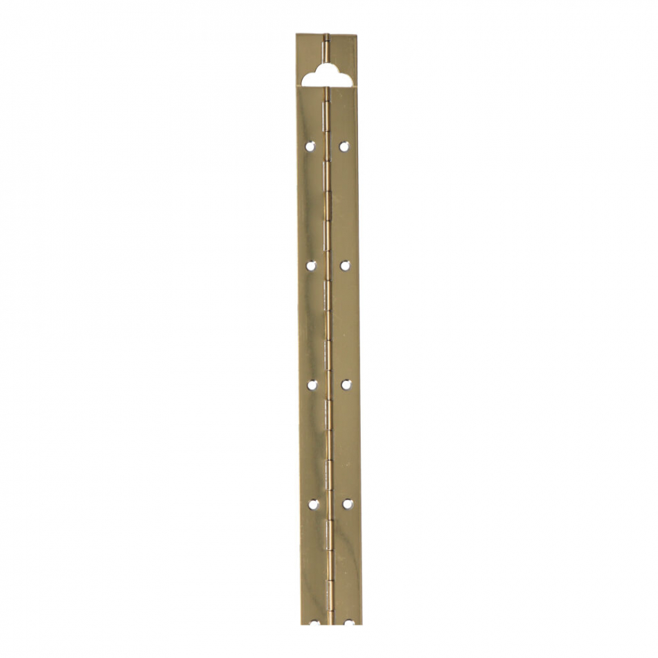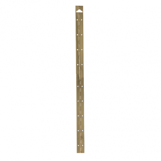 Bisagra de piano en tira de acero de 32x960mm. espesor de 0,70mm. incluye agujero colgador. presentacion en blister. acabado latonado. (tornillos no incluidos)