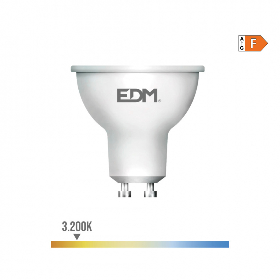 Bombilla dicroica led gu10 7w 550m 3200k luz calida ø5x5,5cm (diámetro/alto) 25000h ac 220-240v clase energetica: f. angulo de apertura: 45° edm
