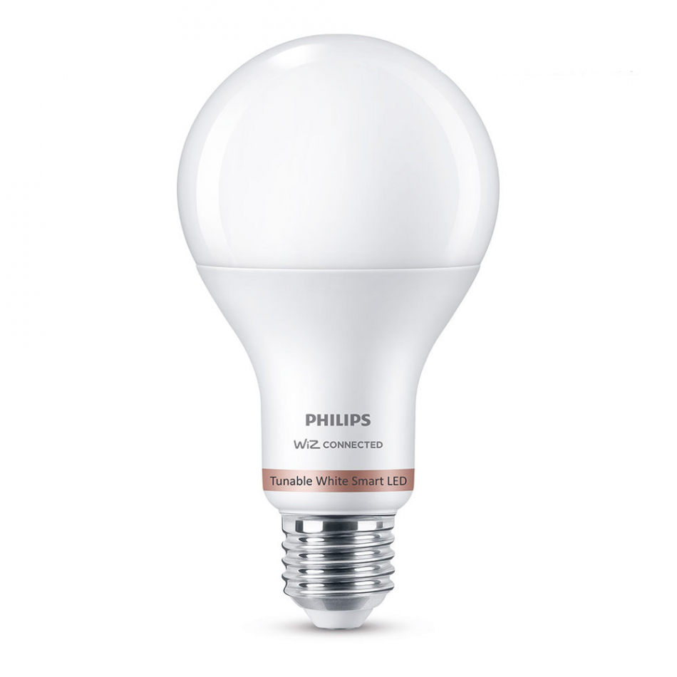 Bombilla led standard e27 13w 2700k-6500k 1521lm wifi philips wiz. la bombilla a67 philips smart led de alta luminosidad ofrece tonos de luz blanca cálida o fría para los accesorios estándar de tu hogar. esta bombilla se conecta a wiz. úsala con tu wifi para controlarla con la aplicación wiz o con tu propia voz.