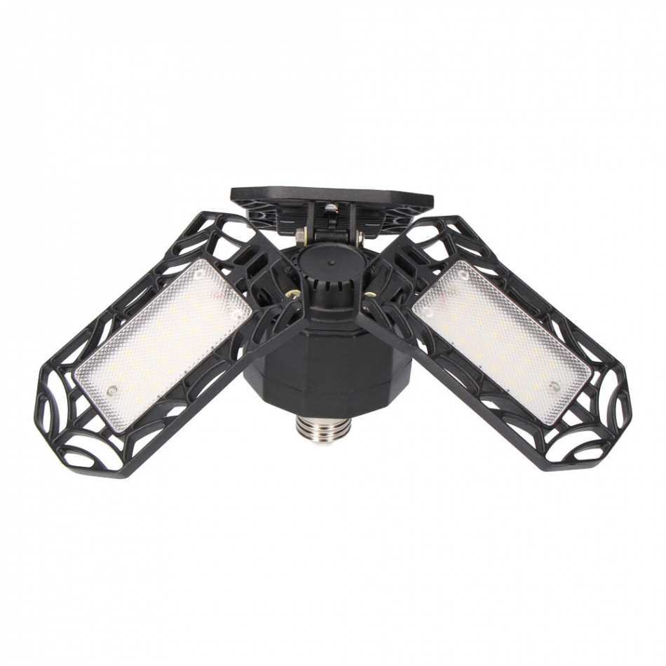 Bombilla "leaf" led e27 60w 6400lm 6500k luz fria edm. esta bombilla esta compuesta por 3 luminarias plegables hasta 90°, grado de apertura de luz 180° a 360° fabricada en plastico y aluminio. ip20, 72 leds, ideal para garajes, almacenes... medidas: ø26,5x12cm 220-240v