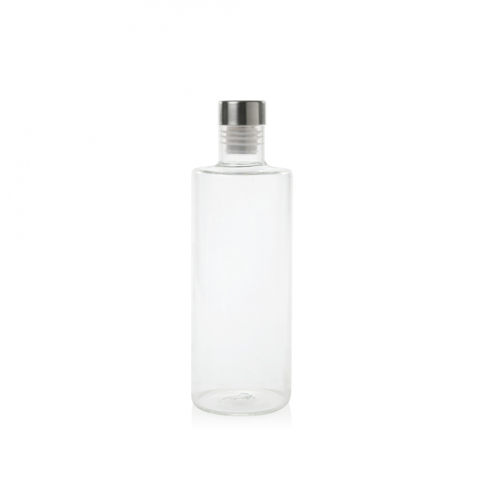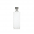 Botella de agua de cristal transparente con tapon de acero inoxidable con rosca antigoteo 1 litro. ø 8 x 29 cm