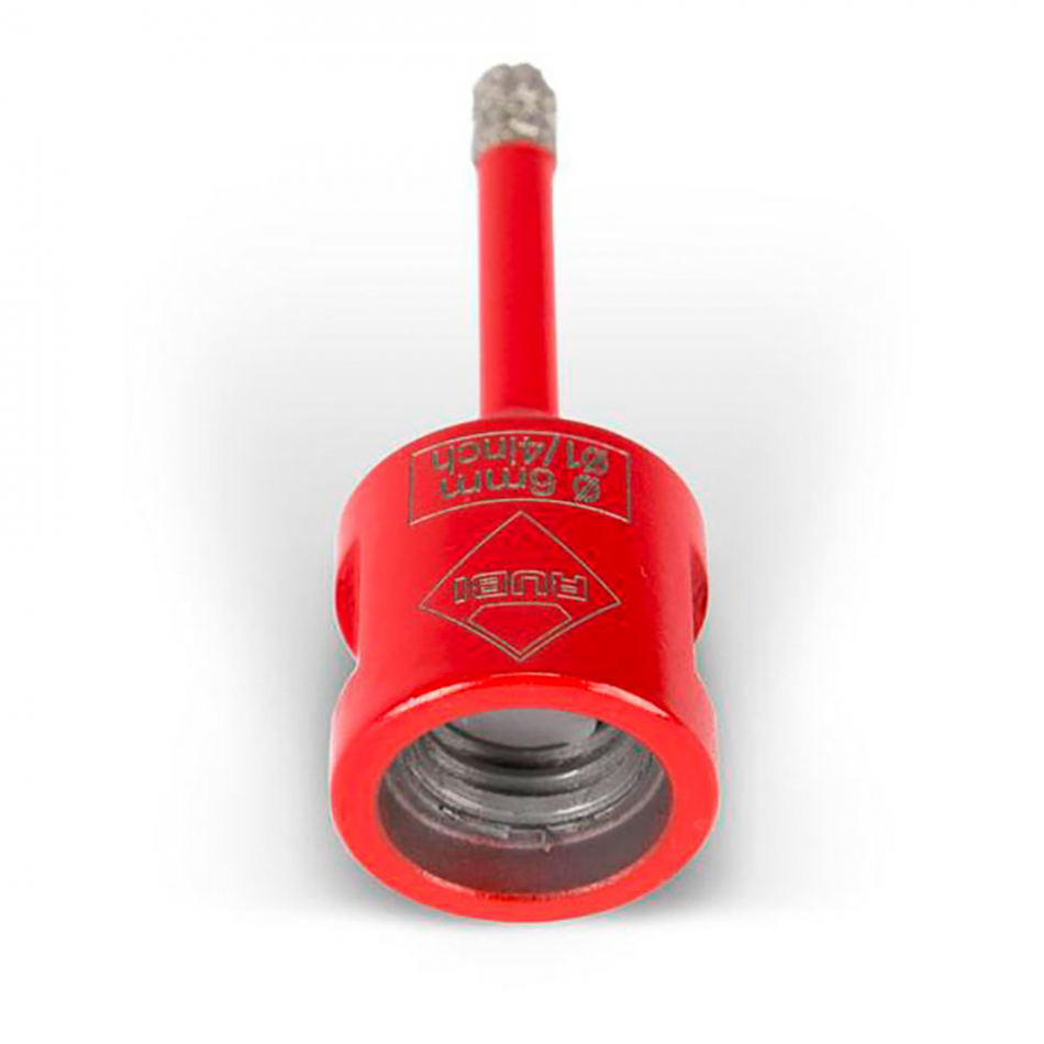 Broca para amoladora drygres ø6mm. 5988 rubi. recomendable para la perforación de todo tipo de baldosa cerámica, en especial las de gres porcelánico, y otros materiales de revestimiento como el mármol y el granito. realizar un pequeño movimiento orbital constantemente mientras se perfora y perforar solo la cerámica y continuar perforando el soporte con una broca normal para ese uso. son perfectas para la colocación de accesorios de baño o cualquier tipo de accesorio de decoración sobre superficies cerámicas. son de corte seco y pueden ser utilizadas, gracias a su conexión con rosca m14, directamente con una amoladora.