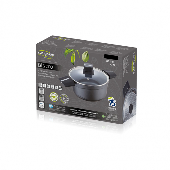 Cacerola ø24x12cm aluminio fundido 1,7mm de grosor ind con tapa bistro grey sg6426 san ignacio. cacerola con tapa interior en aluminio fundido revestimiento exterior en acero quantanian wool en negro mate. dot inducción negro asa soft touch con inserto de silicona gris