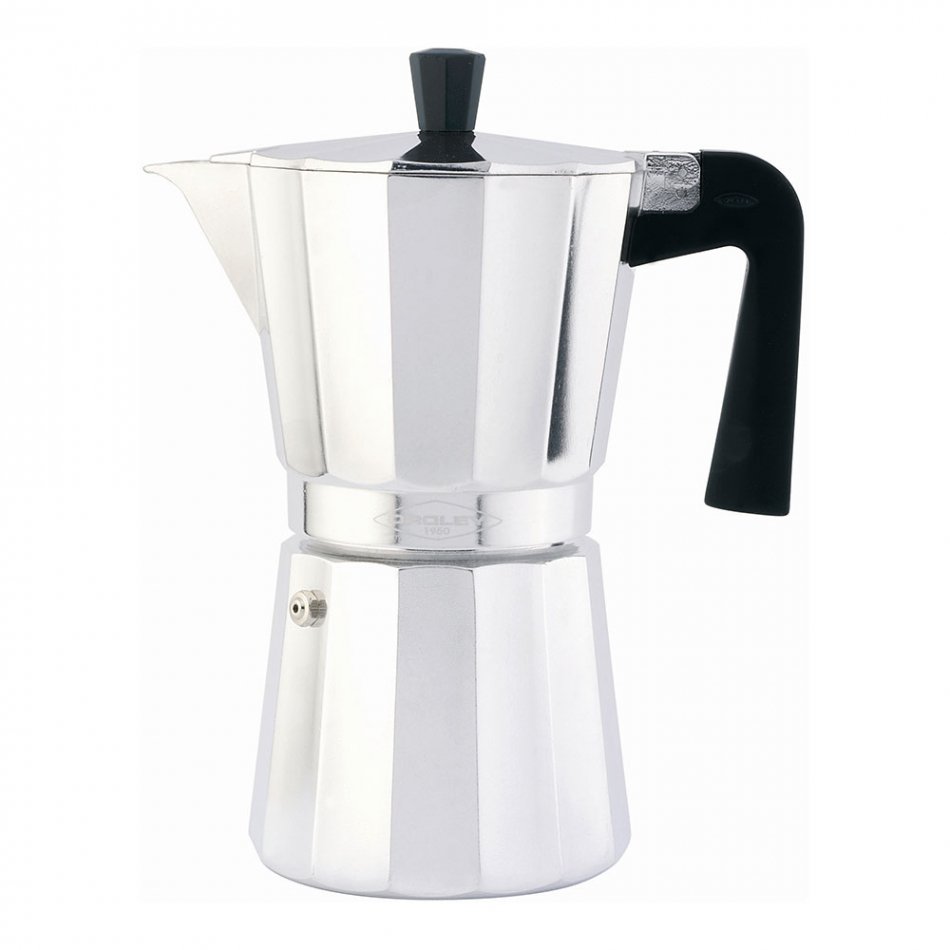 Cafetera de aluminio no apta para inducción, 9 tazas. tiene 14 caras, tanto en la parte superior como en la base, permite aguantar más la presión del interior. asa y pomo de baquelita