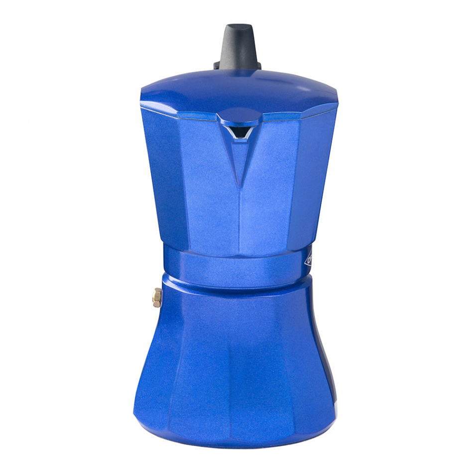 Cafetera de aluminio de 6 tazas modelo "petra" color azul apta para inducción, gas, vitro y eléctrica mango de baquelita negra tacto soft-touch certificación de la válvula de seguridad