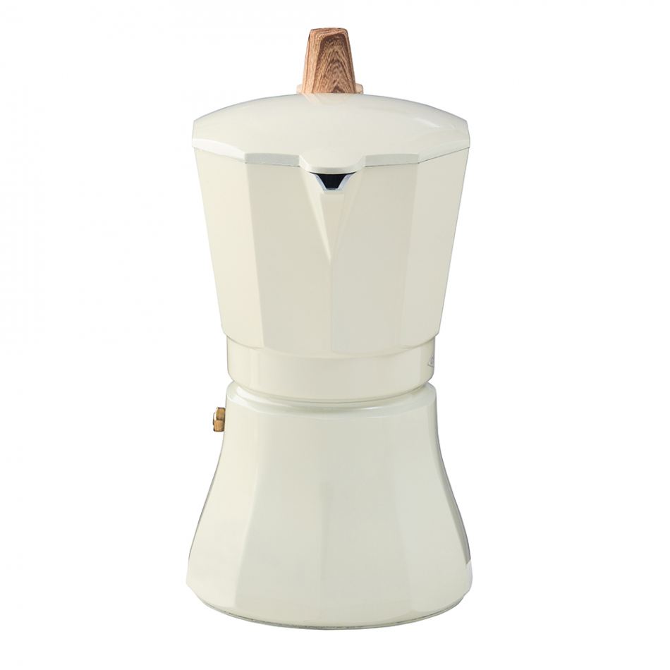 Cafetera de aluminio de 6 tazas modelo "petra" color crema. apta para inducción, gas, vitro y eléctrica. mango de baquelita de imitación madera. tacto soft-touch. certificación de la válvula de seguridad.