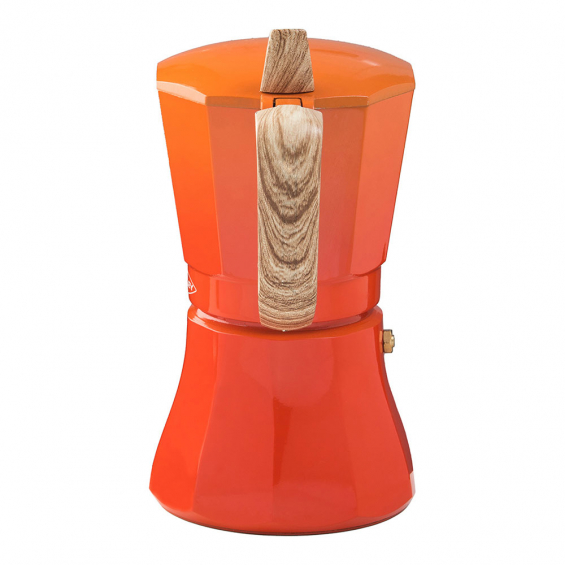 Cafetera de aluminio de 6 tazas modelo "petra" color naranja apta para inducción, gas, vitro y eléctrica mango de baquelita imitación madera tacto soft-touch. certificación de la válvula de seguridad