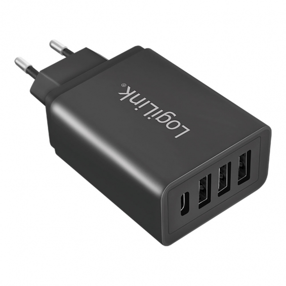 Cargador rápido 27w x 4 usb (solo enchufe pared) logilink. dispone de 3 puertos usb a + 1 usb c para conectar hasta 4 dispositivos a la vez. entrada: 100-240 v ca, 50/60 hz 0,5 a máx. salida: usb-a: 5v/2.4a (12w) máx. usb-c: 5v/3a (15w) máx. protección contra sobrecarga, sobredescarga y cortocircuito compatible con la mayoría de teléfonos inteligentes y tabletas.