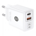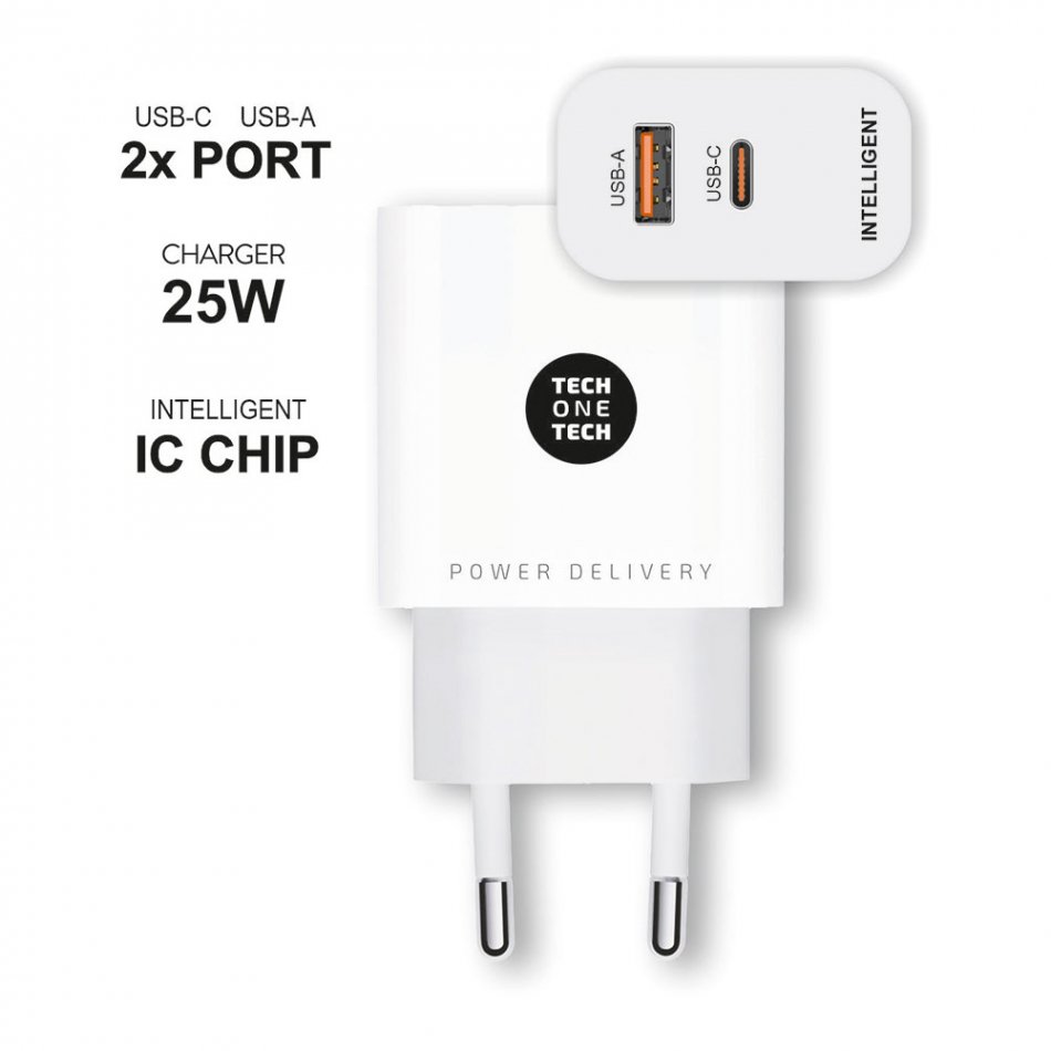 Cargador ultrarrápido power delivery 3.0 (pd) 25 w, color blanco. carga hasta un 400% más rápido que un cargador estándar de 5 w. compatible con dispositivos anteriores. 2 conectores: usb-c de 25 w + usb-a de 18 w. compatible con iphone