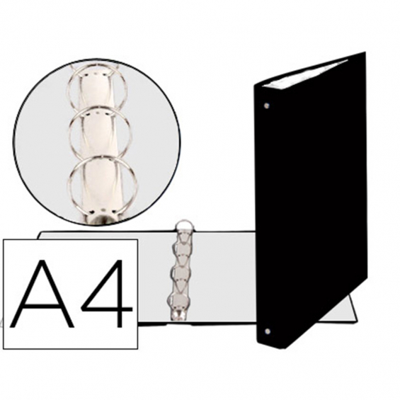 Carpeta de 4 anillas 30mm redondas dina4 forrada negra. carpeta fabricada en cartón forrado en polipropileno. 4mm de grosor. dimensiones: 260x40x320mm (ancho/fondo/alto). producto ecológico.