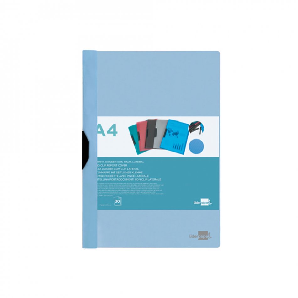 Carpeta dossier pinza lateral pp din a4 azul celeste liderpapel. portada transparente de 180 micras y contraportada opaca. para 30 hojas. pinza deslizante