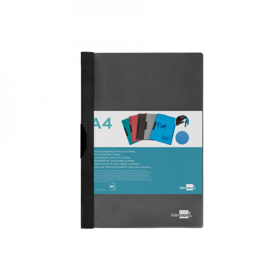 Carpeta dossier pinza lateral pp din a4 negra liderpapel. portada transparente de 180 micras y contraportada opaca. para 30 hojas. pinza deslizante
