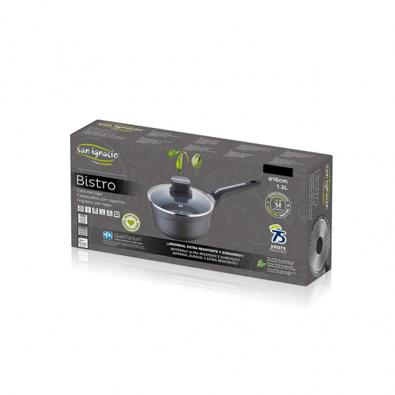 Cazo ø16x8.0cm aluminio fundido ind con tapa bistro grey sg6424 san ignacio. cazo con tapa interior en aluminio fundido revestimiento exterior en acero quaantanium wool en negro mate. dot inducción negro asa soft touch con inserto de silicona gris