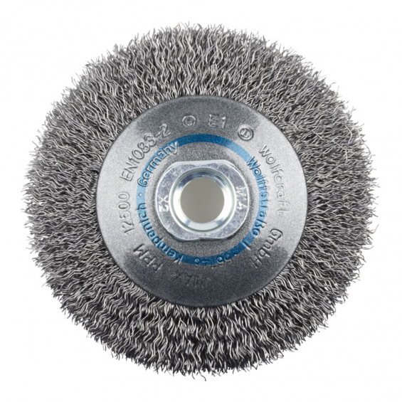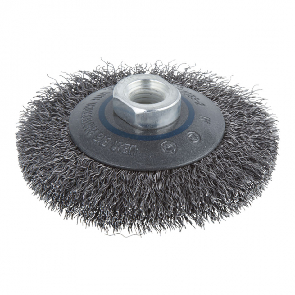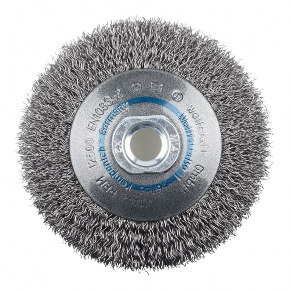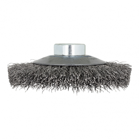 Cepillo cónico de alambre de acero rosca m14, ø100 x 15 mm velocidad máxima de rotación 12.500 rpm