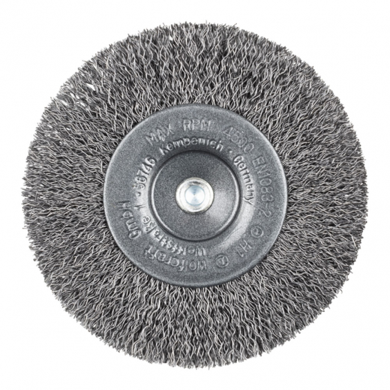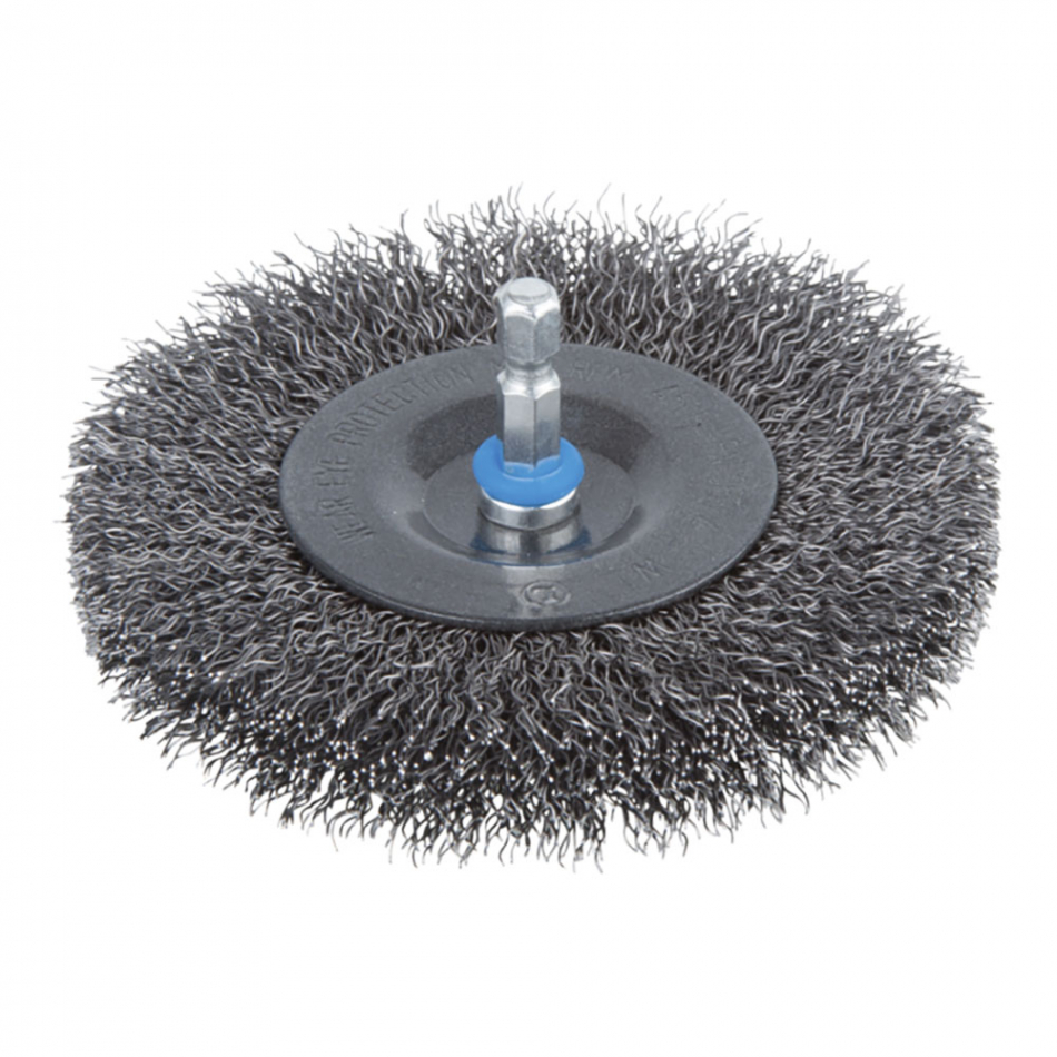 Cepillo de disco de alambre de acero ø100 x 16 mm longitud del alambre 23 mm vástago hexagonal de 6,35 mm (1/4"), longitud de vástago 25 mm, 4500 rpm