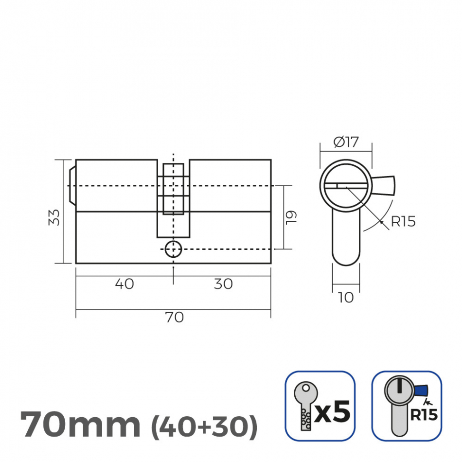 Cilindro latón 70mm (40+30mm) leva larga r15 con 5 llaves de seguridad incluidas