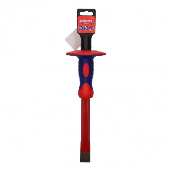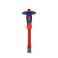 Cincel con protector de 305 mm de largo y la punta plana de 25 x 4 mm. forjado acero al cromo vanadio, tratamiento térmico par durabilidad, acabado con pintura en polvo, protector ergonómico bimaterial, idoneo para cortar y romper hormigón
