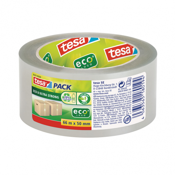 Cinta de embalar transparente ecológica 50 mm x 66 m. fabricado con un 70% de pet posconsumo reciclado, adhesivo acrílico a base de agua, sin disolventes, ideal para envasar hasta 30 kg, alto poder de sellado y resistencia a la tracción, fácilmente reciclable (certificado según el método ingede 12)