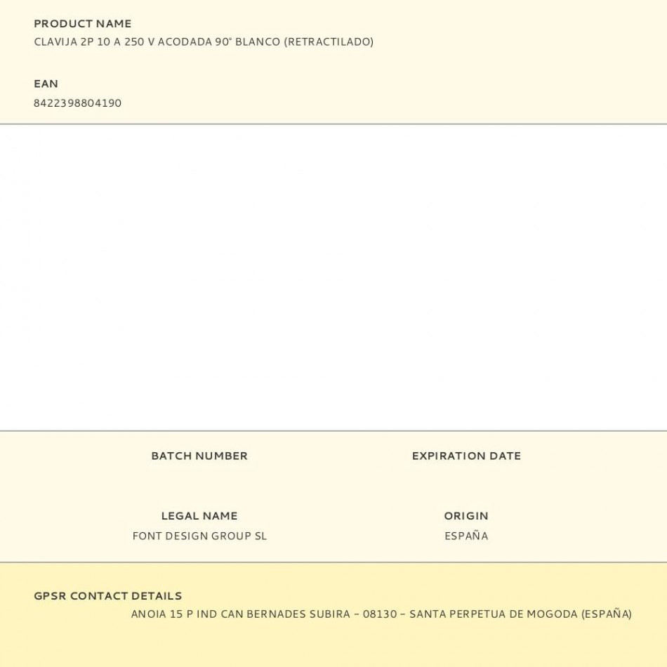 Clavija 2p 10 a 250 v acodada 90° blanco (retractilado)