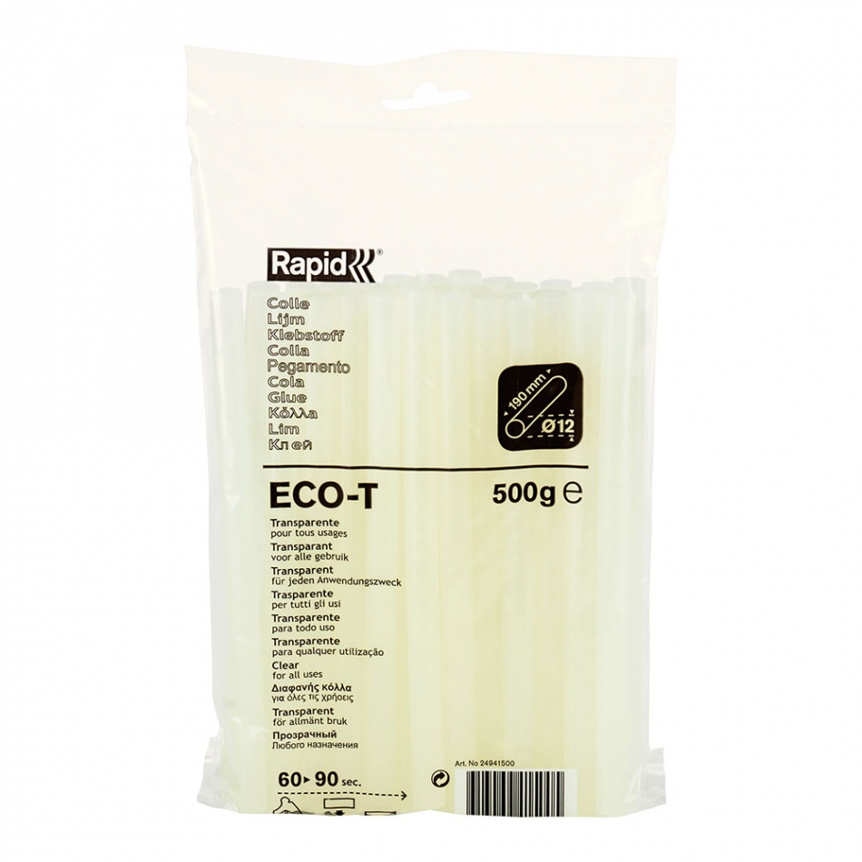Cola 500g eco t ø12x190mm trasparente 24941500 rapid. cola eco-t ø12x190mm transparente. se puede usar en madera, piel, tejidos, corcho, materiales plásticos, loza y cartón. barras de cola de ø12x190mm de largo. color translúcido. temperatura de aplicación: 160-200°c