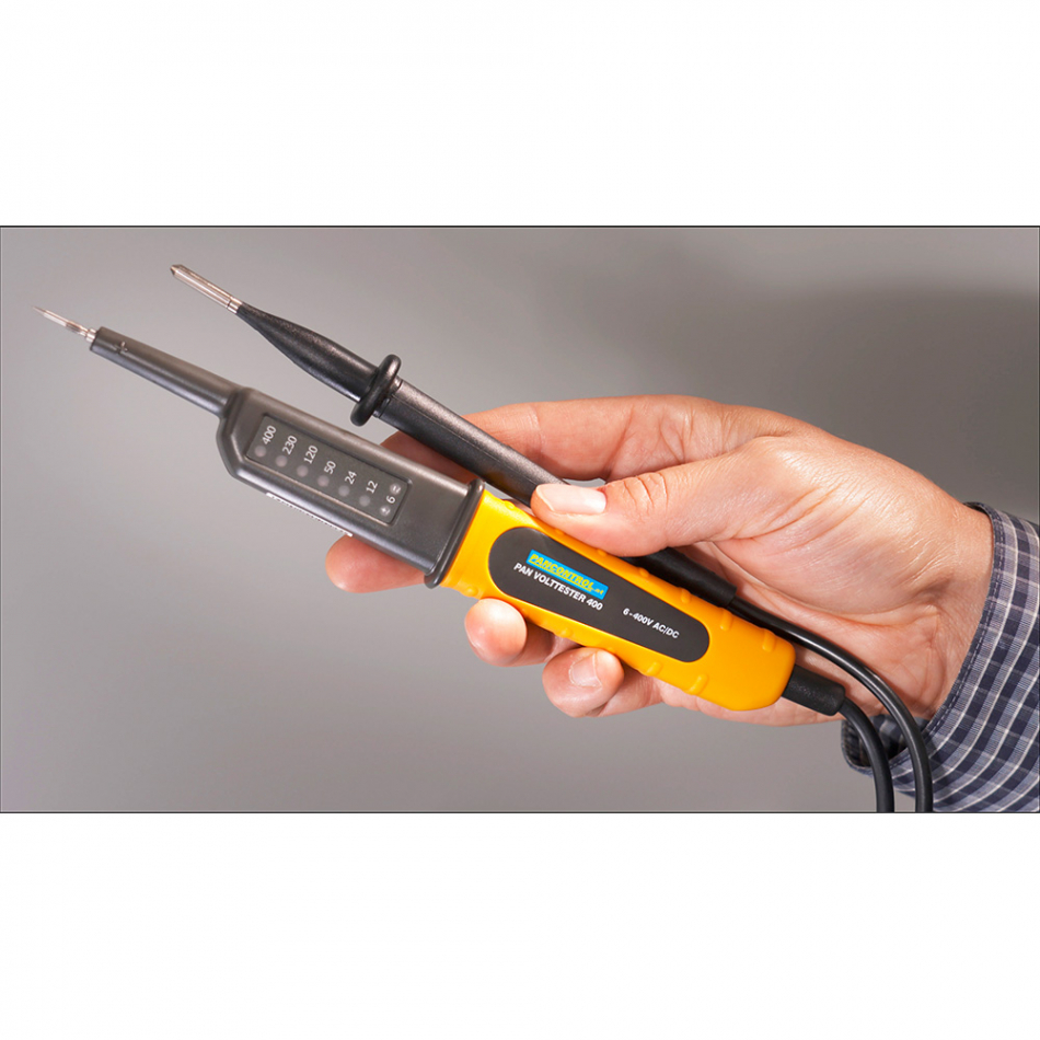 Comprobador de voltaje de 2 polos pan volttester 400 pancontrol. 8 leds de 6-400v ac/dc. verde: para bajas tensiones de hasta 24v. rojo: para tensiones peligrosas de 50v. indicador de polaridad dc. apto para uso en interiores. no se requiere batería.