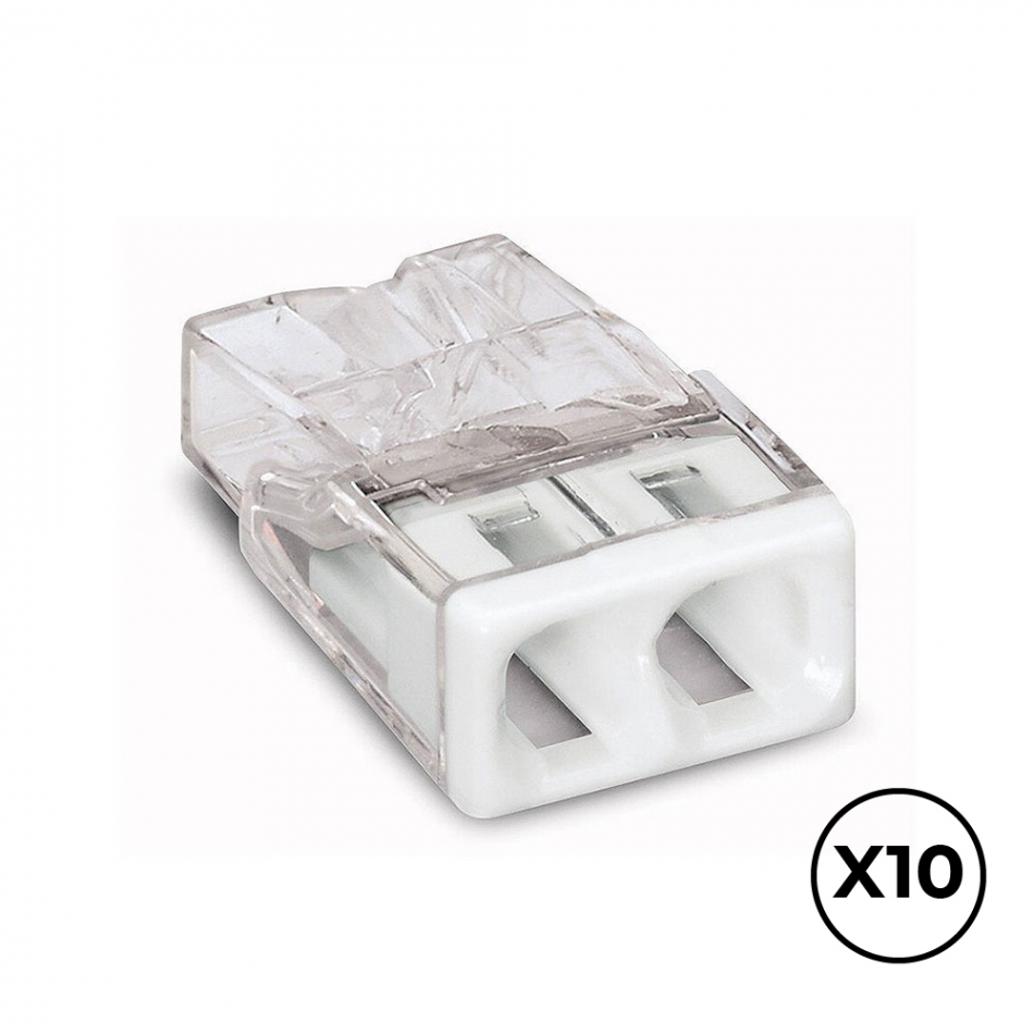 Conector rápido para 2 conductores rígidos de cobre o aluminio, diámetro entre 0,5 a 2,5 mm², 450 v, 24 a temperatura máxima 60°c policarbonato transparente tapa blanca 10 x 16,7 x 5,8 mm. contiene 10 unidades