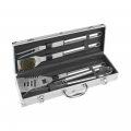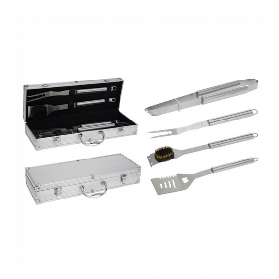 Conjunto de 4 utensilios para barbacoa. acero inoxidable, en caja de aluminio (46x16x8cm), set 4 pzs: 1 pinzas de 43cm, 1 espatula de 43cm, 1 tenedor de 43cm, 1 cepillo de 43cm